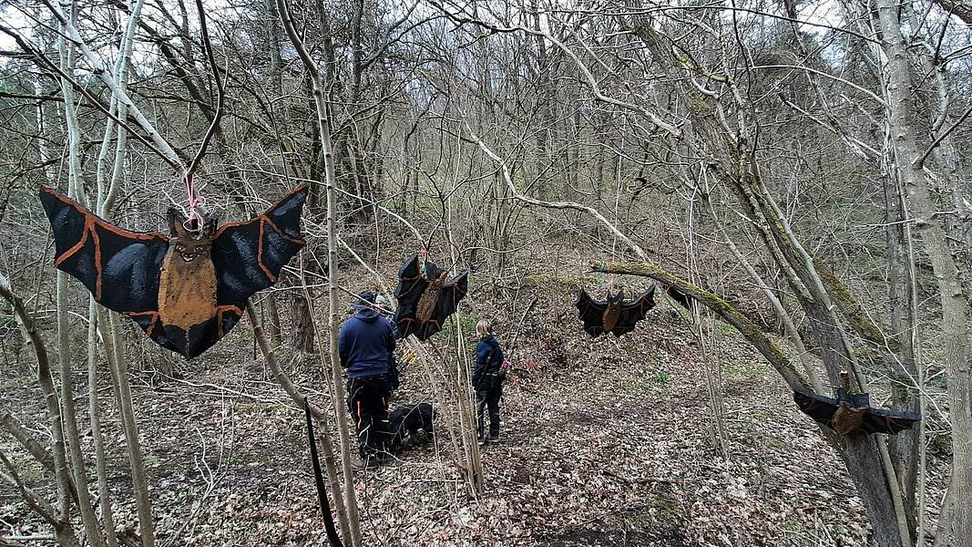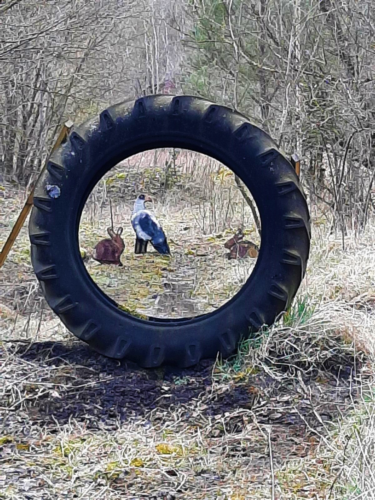 Gleich unsere 1. Station war ein beweglicher Adler. Durch einen Schuss auf Krähen, die mit einem Faden an einer Schere verbunden waren und durch einen Treffer durchgeschnitten wurde, fing der Adler an zu schwingen. Geschossen wurde von einem der unzähligen Hochstände.