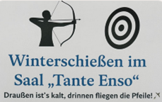 Ab sofort heißt es: jeden Dienstag ab 18 Uhr Training im Saal „Tante Enso“ ! Geschossen wird auf Scheiben und Tierziele – ganz wie draußen im Parcours, nur ohne kalte Finger und mit einer Extraportion Gemütlichkeit.